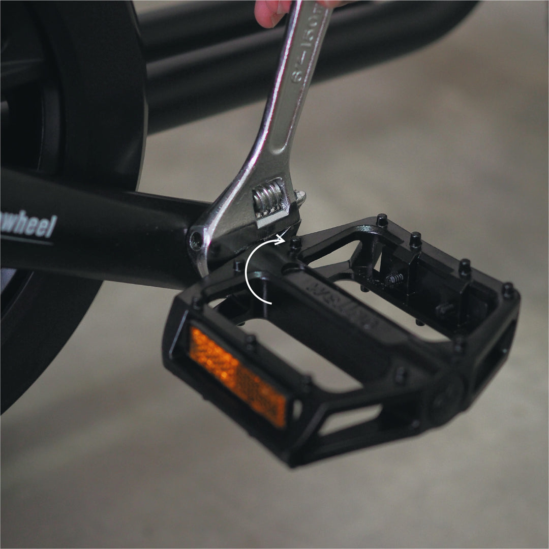 Finish tightening the pedals using the supplied 15 mm wrench. The pedals must be very tight. Check and retighten the pedals after your first two rides.