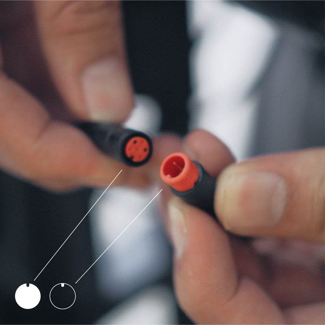 Once headlight is installed, connect the red higo plug to controller by aligning arrows on both ends and pushing into place. The headlight is ready for use.