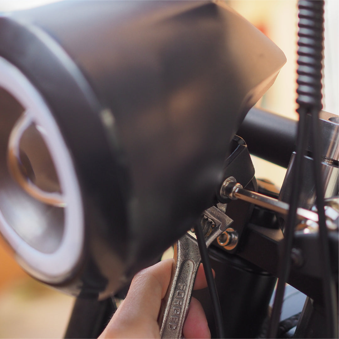 Using a 5mm hex wrench, tighten the mounting screws in place to secure the headlight to the crown.