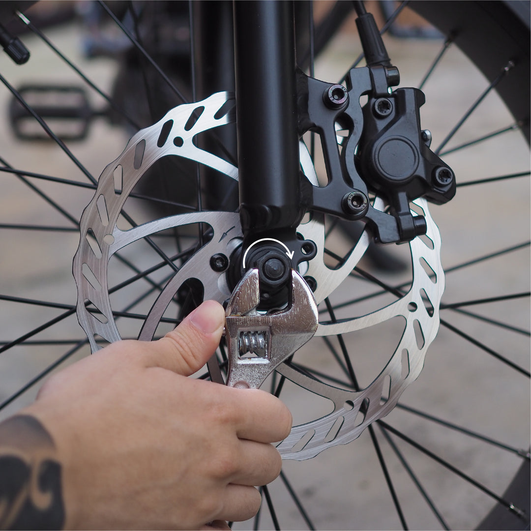 Insert the front wheel in between the forks while positioning the front brake disc in the brake caliper.The disk rotors are sharo, take precaution while working with or close to them.