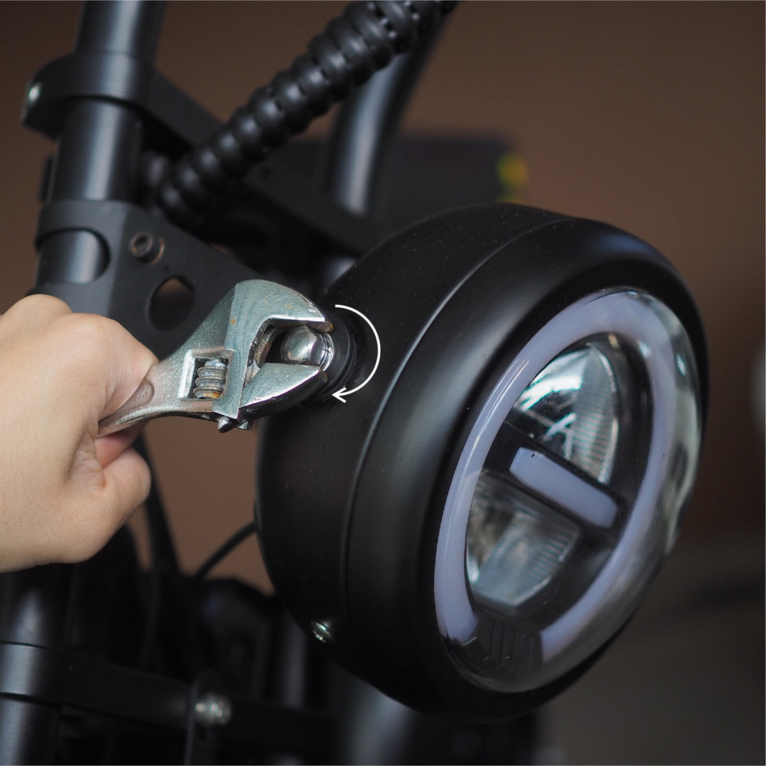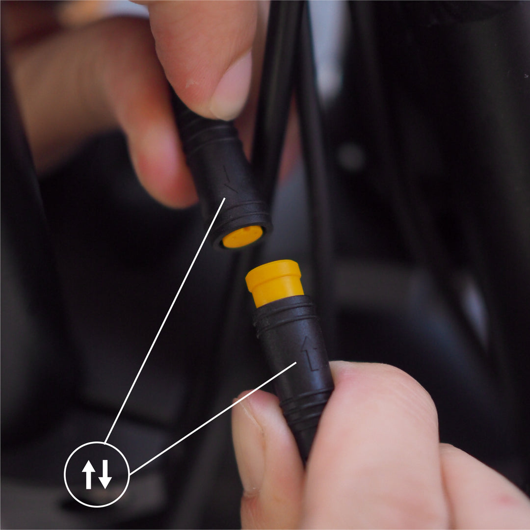 Once headlight is installed, connect the red higo plug to controller by aligning arrows on both ends and pushing into place. The headlight is ready for use.